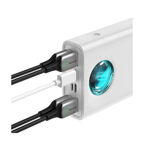 Baseus Amblight 65W Carregador Portátil Power Bank é uma bateria com capacidade de 30.000 mAh para carregamento rápido de laptops como um MacBook Pro de 13” de 0 a 50% em uma hora e compatível com dispositivos que exigem menos saída de energia. Possui 5 portas onde todas suportam saída de energia e 2 entradas de suporte.